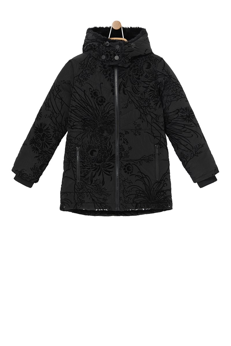 Veste à capuche pressionnée avec liens de serrage et fourrure synthétique.