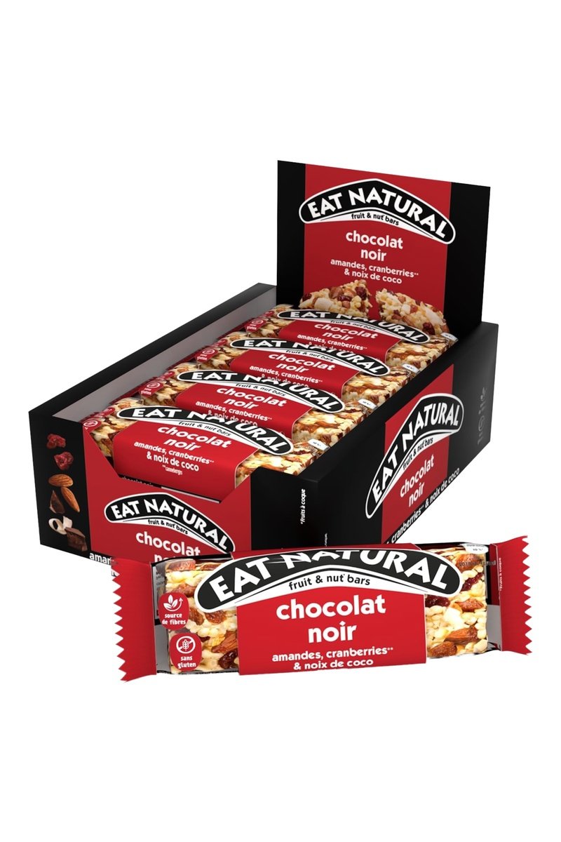 Ingrédients : chocolat noir 20% (pâte de cacao, sucre de canne, beurre de cacao), raisins secs (raisins secs 15%**, huile de tournesol), sirop de riz, noix de coco déshydratée 11%, amandes 9%, canneberges sucrées séchées (canneberges séchées 5%, concentré de jus de pomme, huile de tournesol), miel, copeaux de noix de coco déshydratés 7%, billes croustillantes de riz, cacahuètes.