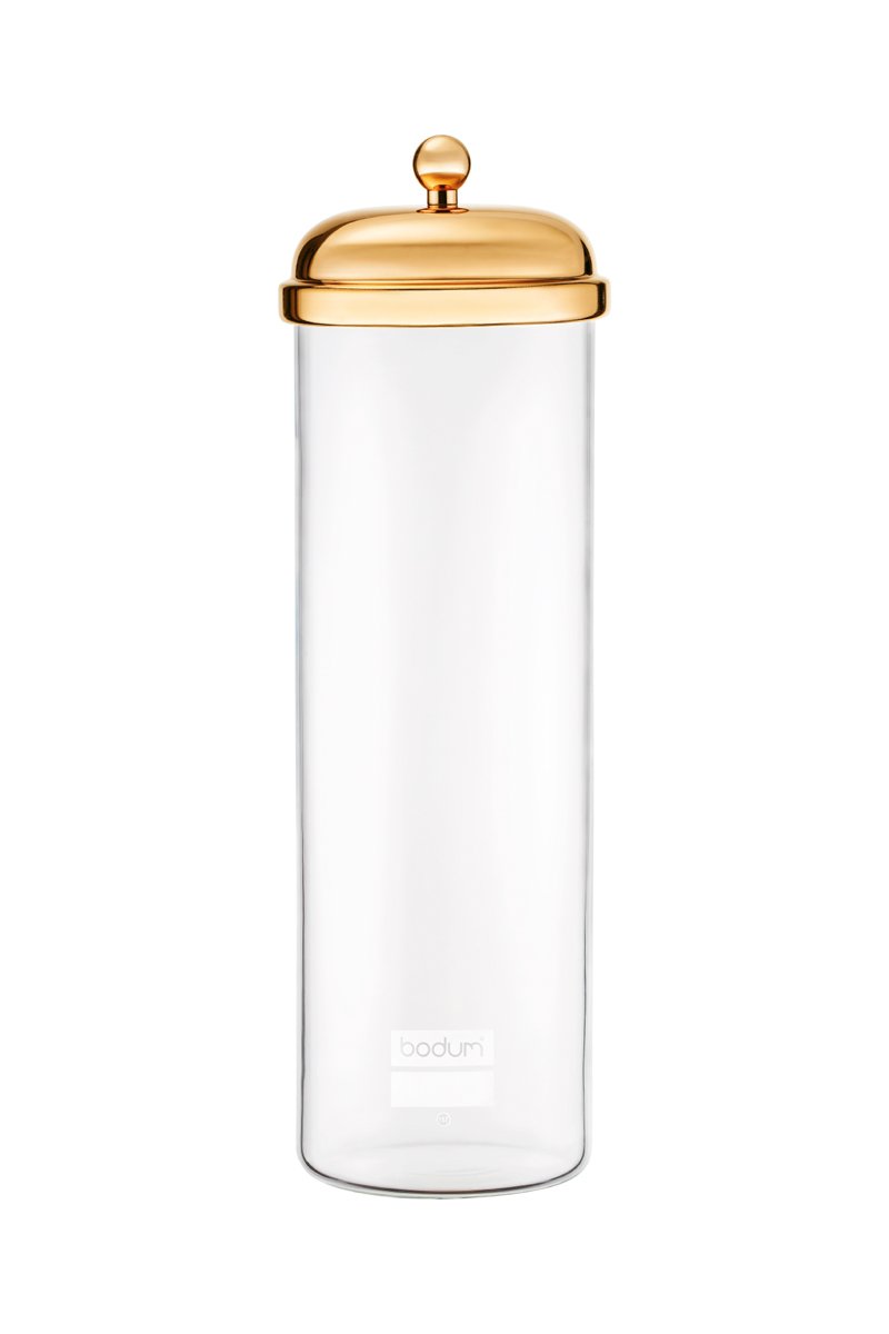 Bocal à spaghetti en verre borosilicate, acier inoxydable plaqué or et silicone.