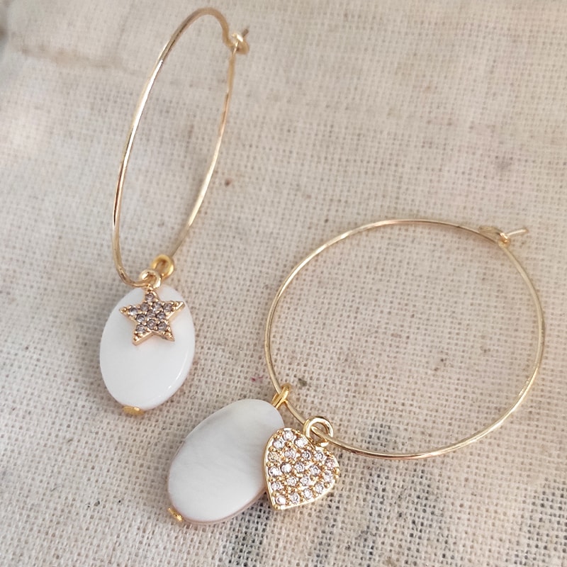 Boucles d'oreilles créoles étoile & cœur - Laiton doré, plaqué or, perle nacré & zircon