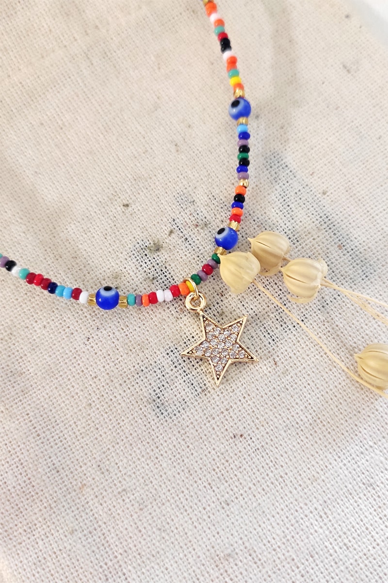 Collier en plaqué or jaune serti de zircons et de perles Miyuki.