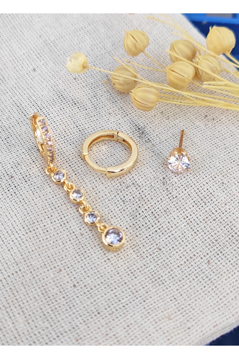 1 boucle d'oreille pendante, 1 puce et 1 créole dorées à l'or fin jaune - Zircons