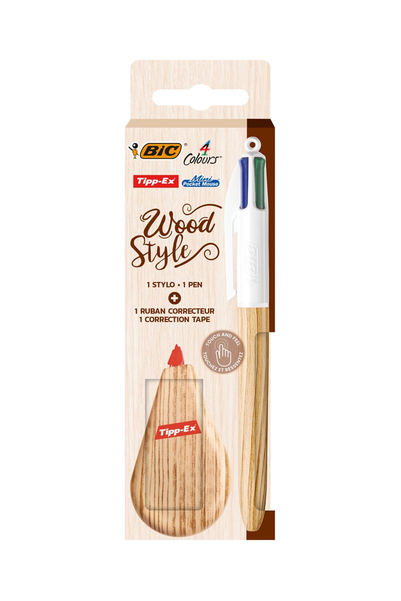Stylo-bille 4 couleurs Wood style et Tipp-Ex mini pocket Wood Style.