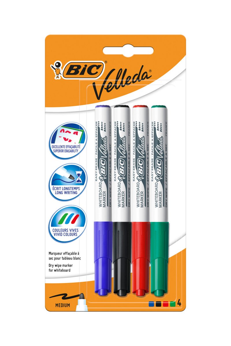 2 x 4 feutres pour tableau blanc effaçables à sec Velleda - Pointe conique moyenne