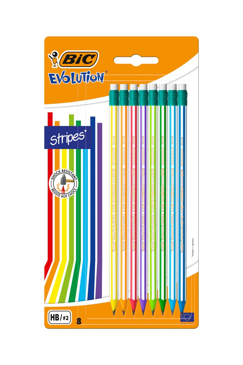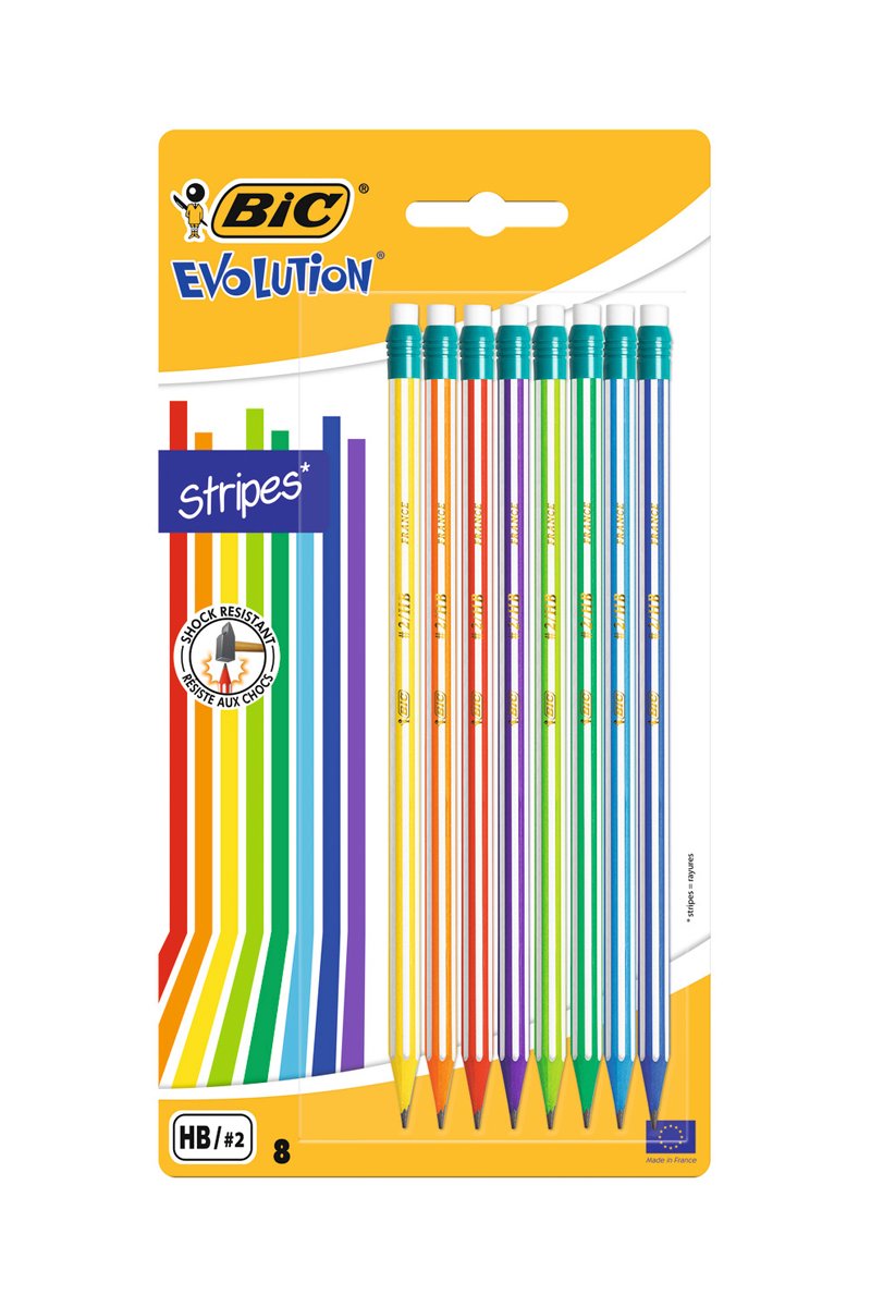 2 x BIC Evolution Stripes avec Gomme Crayons à Papier HB avec Gomme Intégrée - Couleurs Assorties, Blister de 8