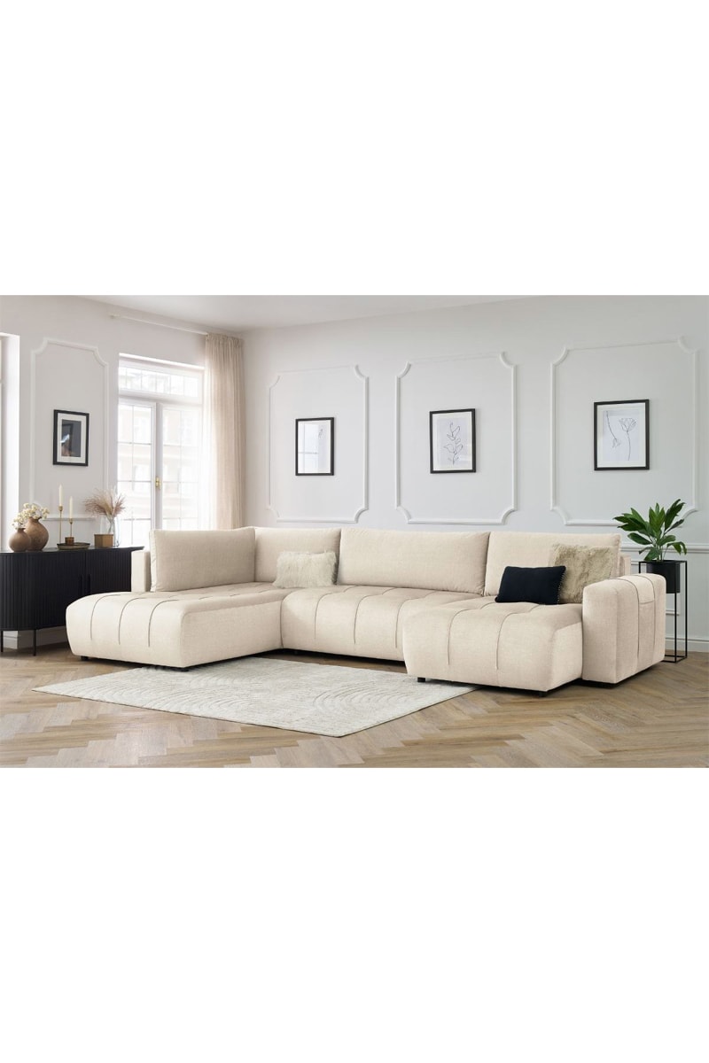 Canapé d'angle droit panoramique convertible Arsene - Beige - Couchage 135 x 325 cm