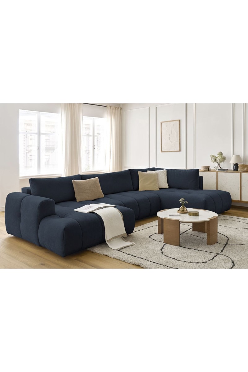 Canapé d'angle gauche panoramique convertible Fugi - Bleu foncé - 5 places - Tissu toucher lisse - Couchage 324 x 135 cm
