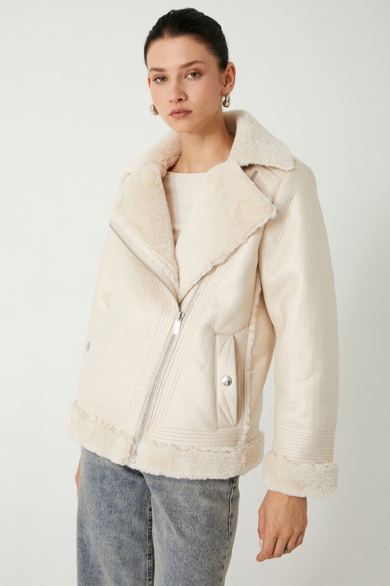Empiècements en fourrure synthétique à l'encolure, sur les manches, les côtés et à la base.
