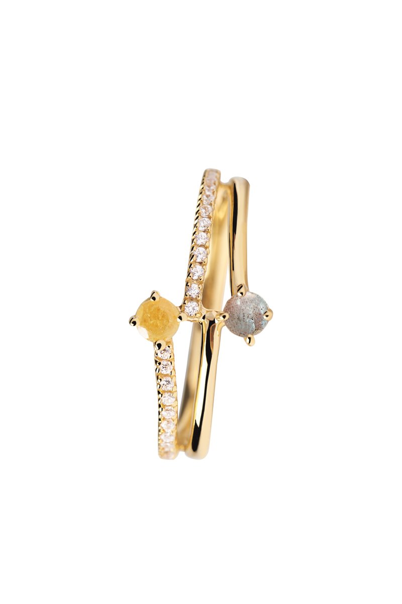 Bague Patio Ring Juno - Argent plaqué or jaune, zircons et labradorites