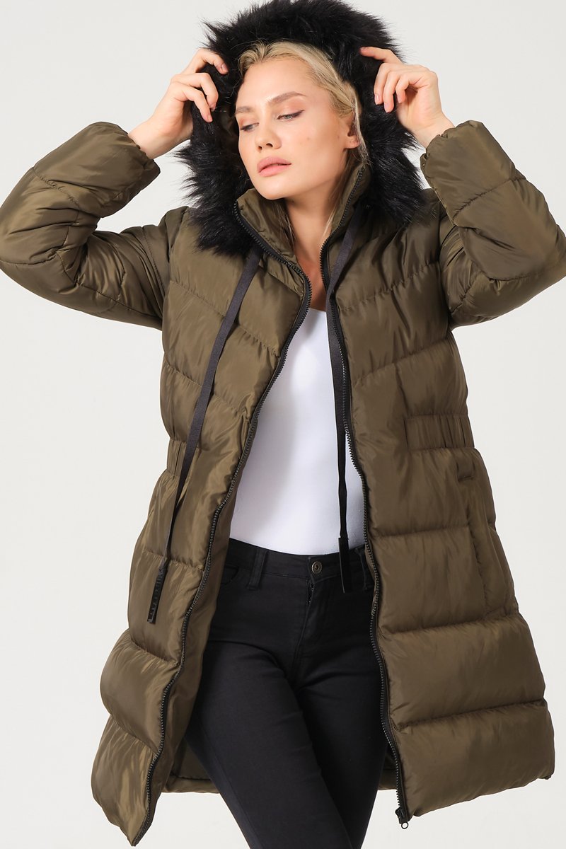 Doudoune à capuche amovible avec fourrure synthétique et liens de serrage.
