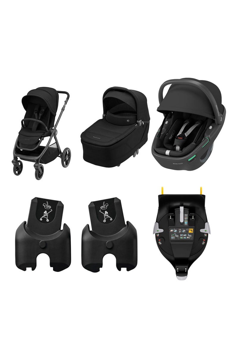 1 x Siège-auto - Noir - Dès la naissance - 40 à 75 cm, 1 x Adaptation pour nacelle, 1 x Poussette pliable Mc Oxford, 1 x Nacelle Sense, 1 x Base siège-auto FamilyFix 360 et 1 x Moufles Maxi-cosi