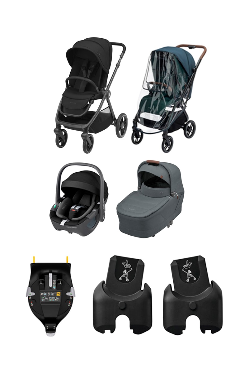 1 x Poussette pliable MC Oxford, 1 x Adaptateur pour nacelle, 1 x Nacelle Sense, 1 x Habillage pluie pour poussette, 1 x siège auto Pebble 360 et 1 x Base siège-auto FamilyFix 360