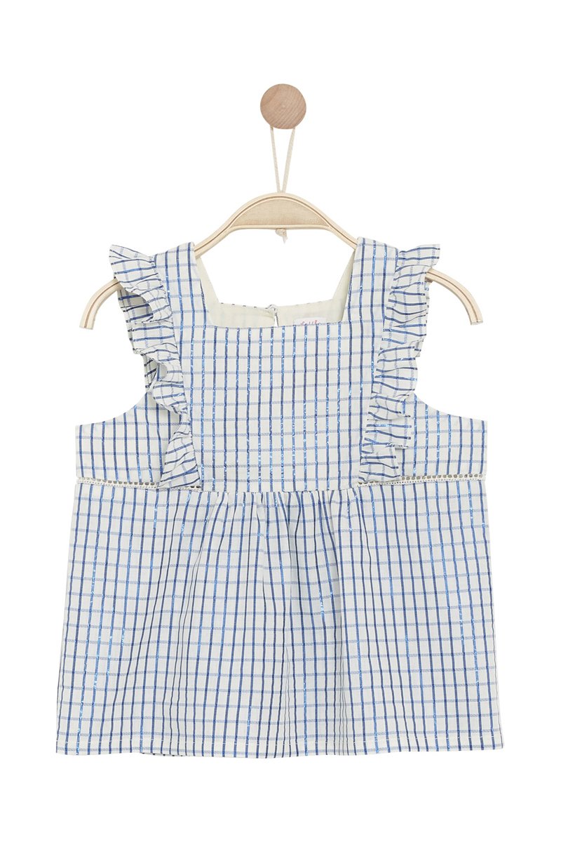 Motifs à carreaux. Volants devant et au dos.