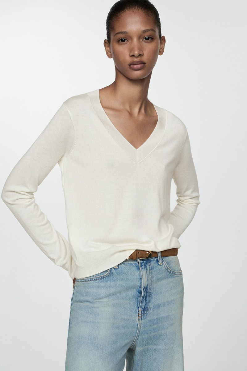 Pull-over maille fine col V - Écru