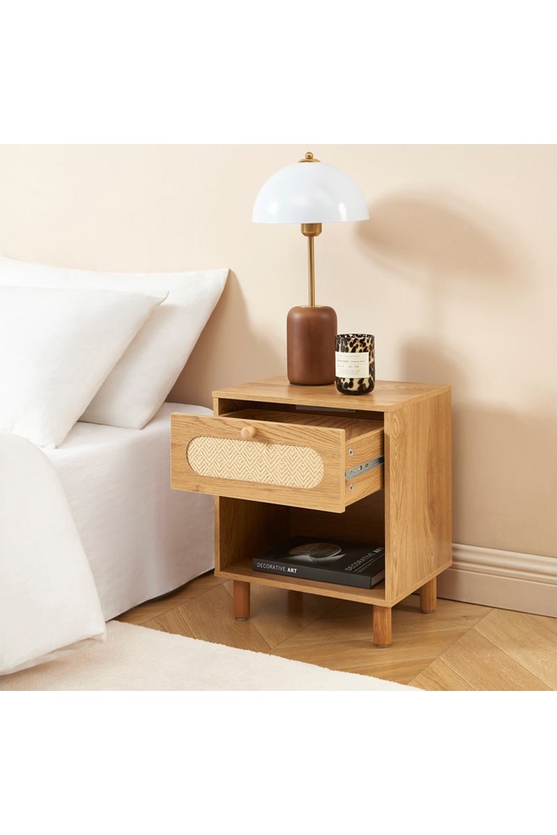 Tiroir en MDF avec revêtement en papier et rotin.