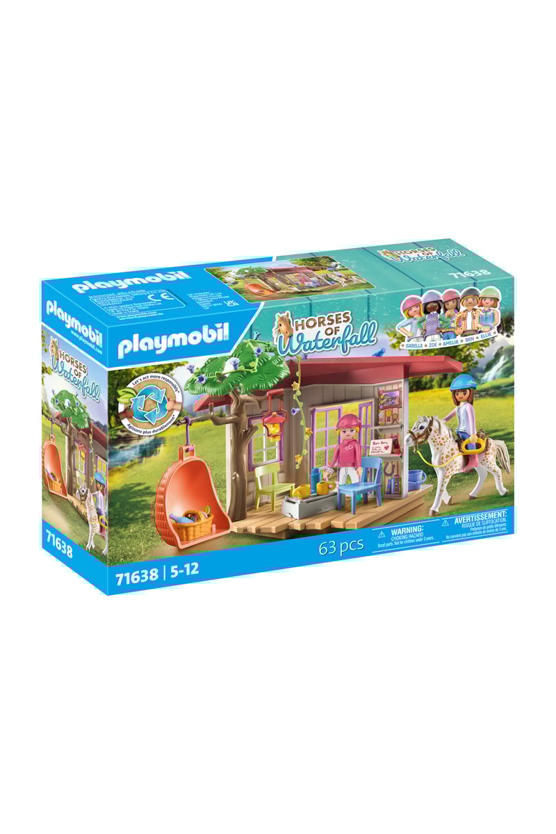63 accessoires inclus tels que : 2 figurines, cheval, terrasse en bois, 2 chaises, table, chaise à bascule, lettre, 2 bagues, bracelet, nœud de cheveux, 2 casques d'équitation.