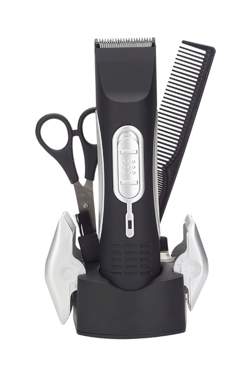 Livrée avec adaptateur de secteur, ciseaux, peigne de coiffeur, brossette de nettoyage et huile.