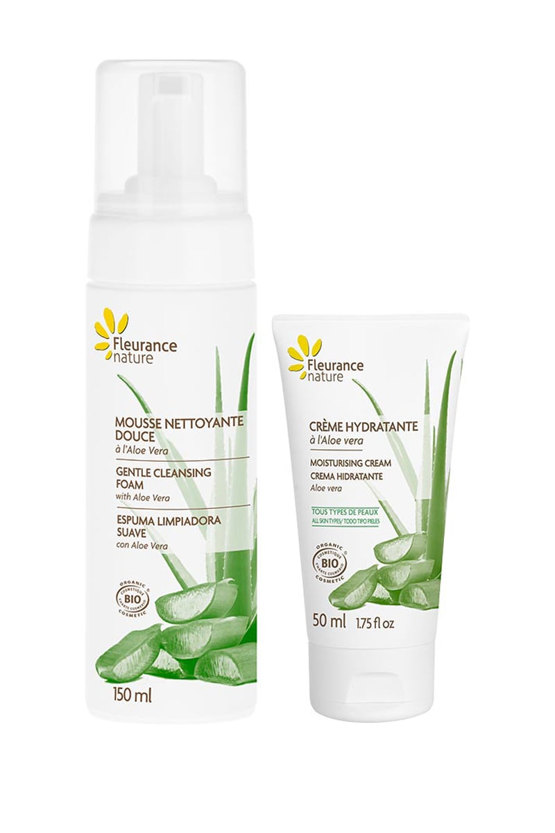 Ingrédients : Composition CREME HYDRATANTE ALOE VERA: AQUA (WATER), SIMMONDSIA CHINENSIS (JOJOBA) SEED OIL*, COCO-CAPRYLATE/CAPRATE, GLYCERIN, CAPRYLIC/CAPRIC TRIGLYCERIDE, GLYCERYL STEARATE CITRATE, CETEARYL ALCOHOL, OLEIC/LINOLEIC/LINOLENIC POLYGLYCERIDES, BUTYROSPERMUM PARKII (SHEA) BUTTER*, CERA ALBA (BEESWAX), ALOE BARBADENSIS LEAF JUICE POWDER*, TOCOPHEROL, PARFUM (FRAGRANCE), XANTHAN GUM, SODIUM HYDROXIDE, DEHYDROACETIC ACID, BENZYL ALCOHOL, LINALOOL, CITRONELLOL. *Ingrédients issus de l’agriculture biologique Composition MOUSSE ALOE VERA: AQUA, GLYCERIN, SODIUM COCOAMPHOACETATE, SODIUM LAURYL GLUCOSE CARBOXYLATE, LAURYL GLUCOSIDE, LIPPIA CITRIODORA EXTRACT*, CAPRYLYL CAPRYL GLUCOSIDE, GLYCERYL CAPRYLATE, INULIN, ALOE BARBADENSIS LEAF JUICE POWDER* , BAMBUSA VULGARIS STEM EXTRACT* , PARFUM, SODIUM CITRATE, POTASSIUM SORBATE, CITRIC ACID, SORBIC ACID, SODIUM BENZOATE. *Ingrédients issus de l’agriculture biologique