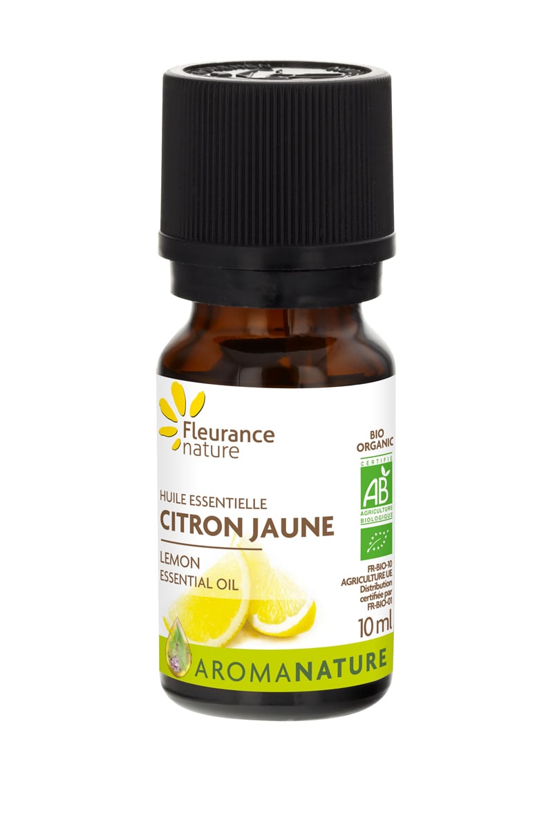 Flacon de 10 ml d'huile essentielle de citron jaune bio.