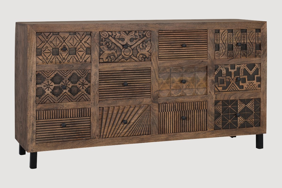 12 tiroirs à motifs fantaisie en relief sculptés à la main.