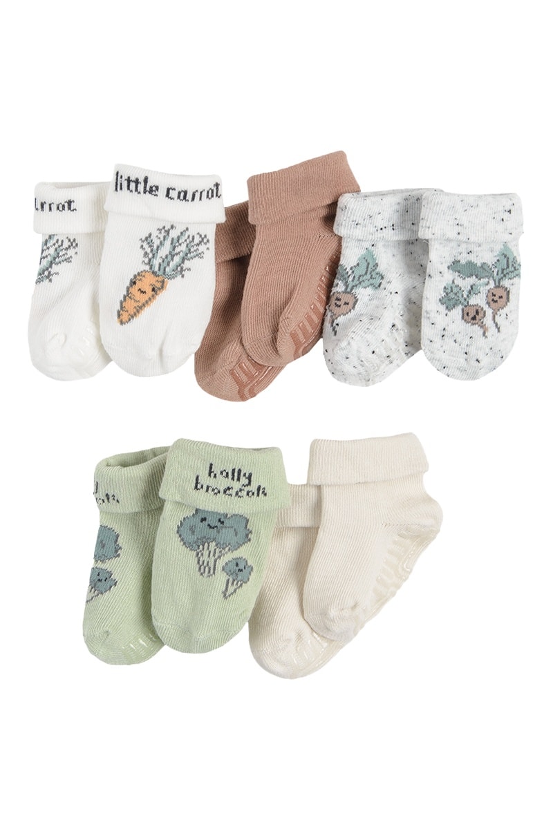 5 paires de chaussettes antidérapantes dont 1 avec lettrage sur la tige et à motif carotte devant, 1 avec lettrage sur la tige et à motif brocoli devant et 1 à motifs navets devant.