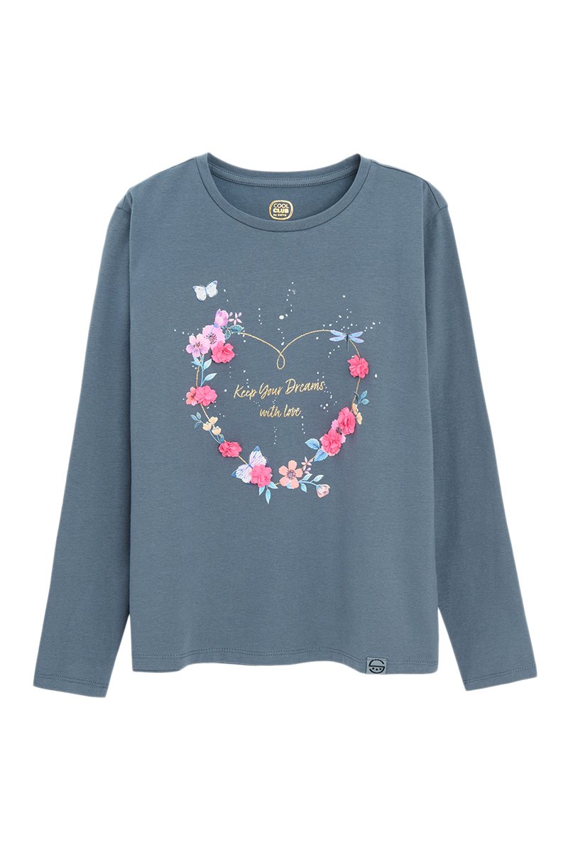Lettrage, empiècements forme fleur et motifs fleurs devant.