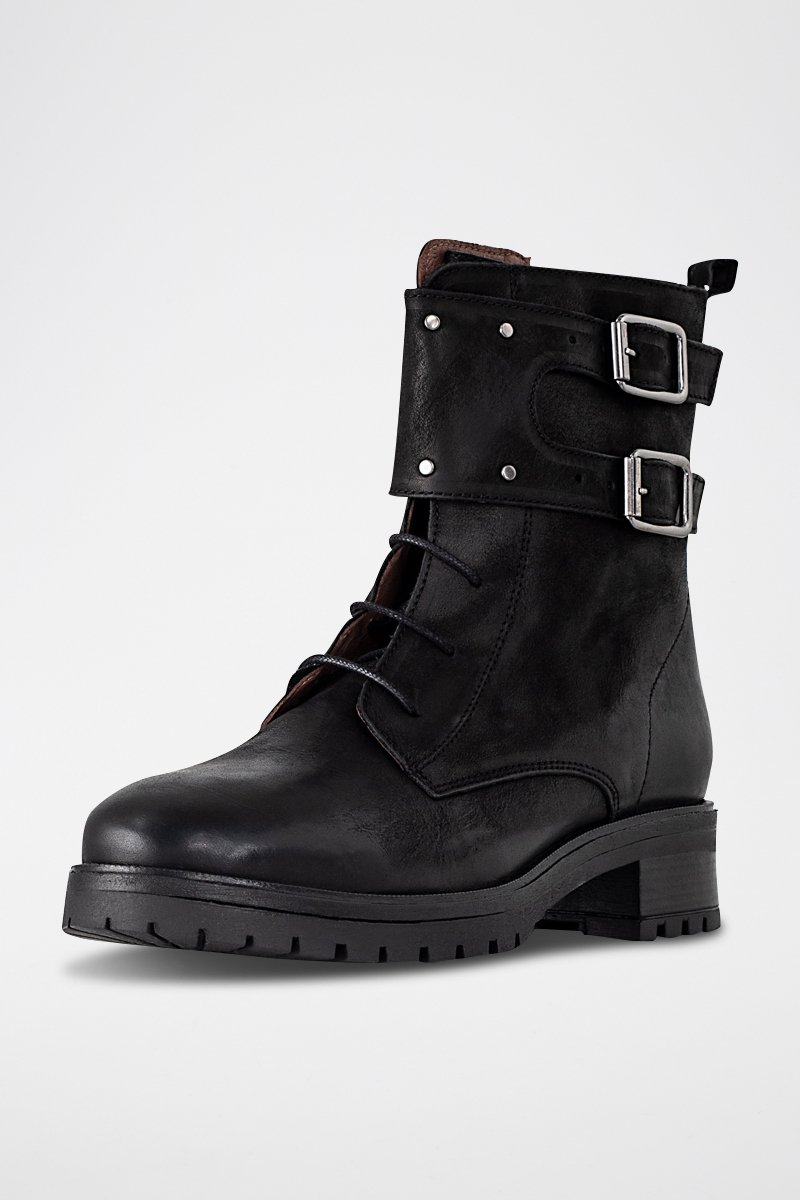 Fermeture par bride à boucle devant et zippée sur le côté.