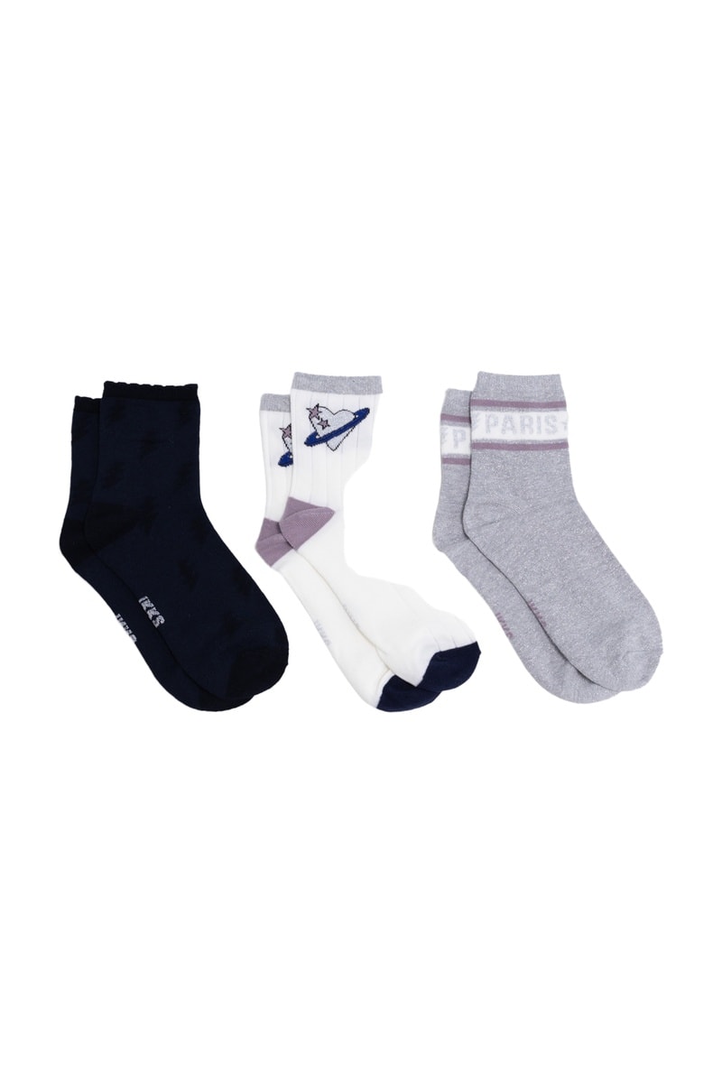 3 paires de chaussettes dont 1 à motifs fantaisie sur la tige et 1 avec lettrage sur la tige.