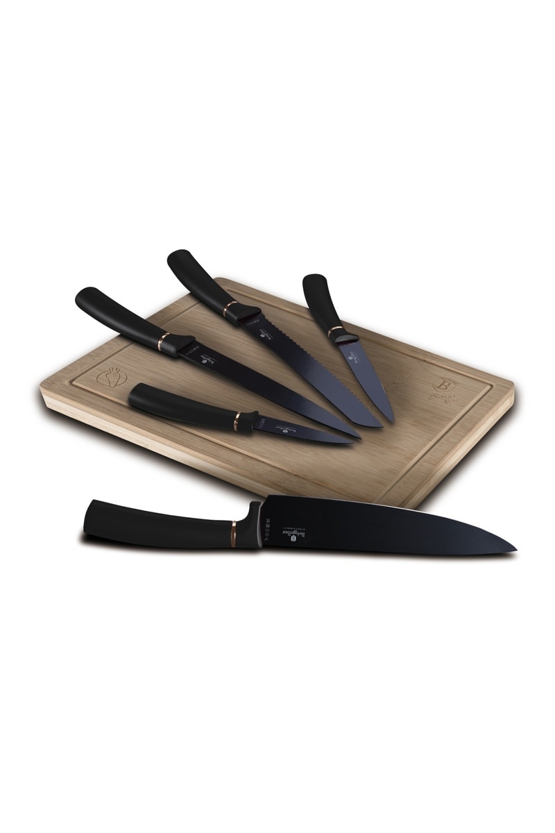 5 couteaux en acier inoxydable et planche à découper en bambou Black Rose