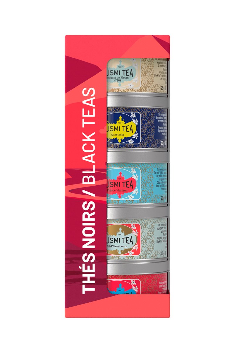 Coffret de 5 boites Les Thés noirs bio et pince à thé comprenant :