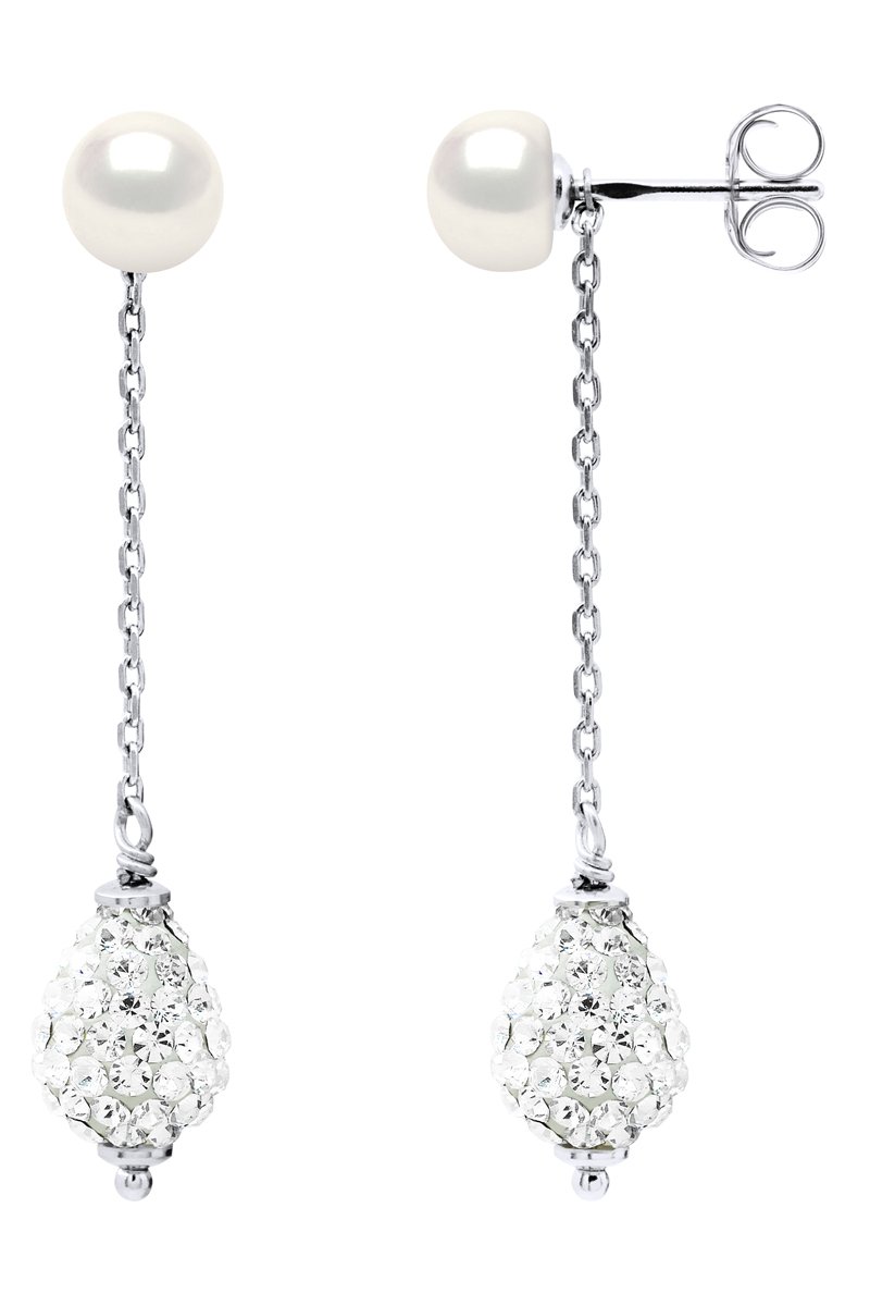 Boucles d’oreilles pendantes en argent serties d'une perle de culture d’eau douce et de cristaux.