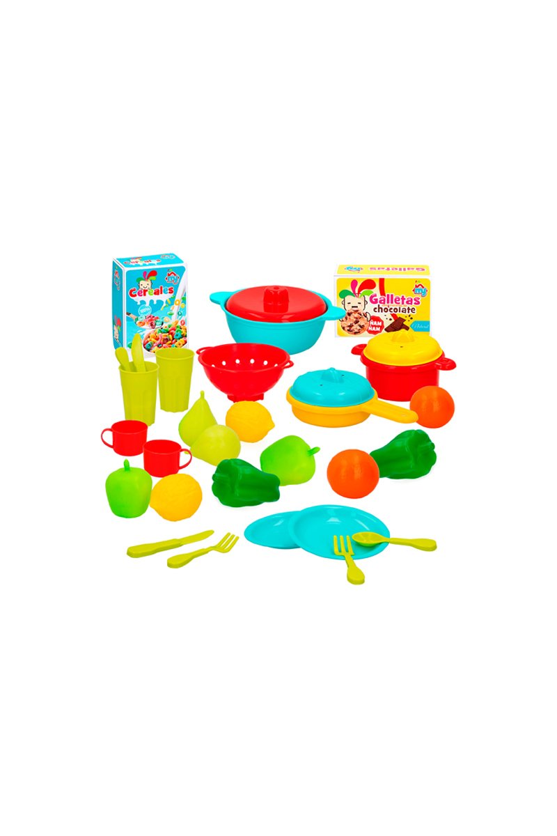 Contenu : boîte de céréale, boîte de gâteaux, 6 couverts, 3 couvercles, 2 casseroles, 2 verres, poêle, 2 assiettes, passoire, 2 tasses, 2 pommes, 2 citrons, 2 poivrons et 2 oranges.