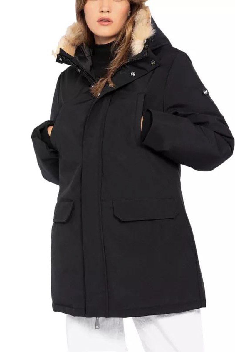 Capuche avec liens de serrage et fourrure synthétique amovible.