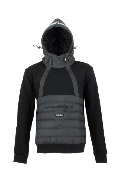 Un patch sur la manche et un logo imprimé sur la capuche soulignent l'identité de la marque.