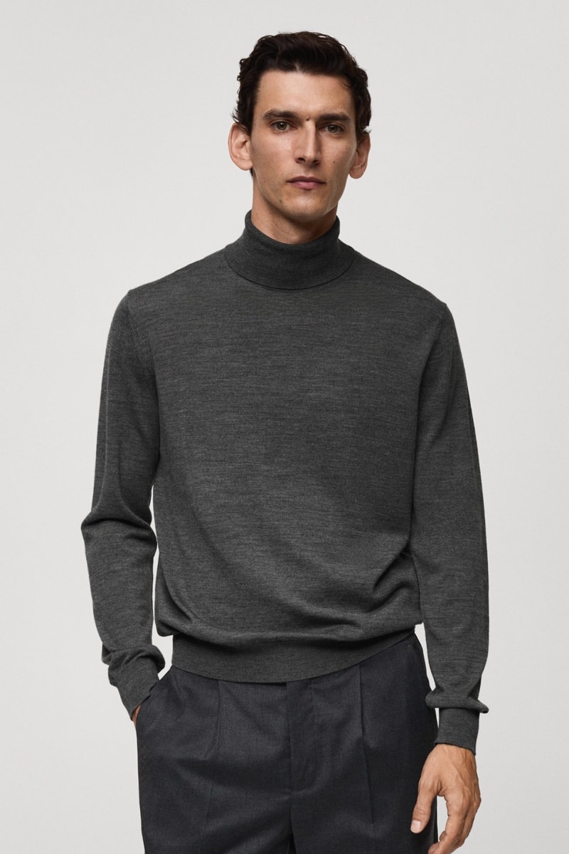 Pull-over 100 % laine mérinos col montant - Gris foncé chiné