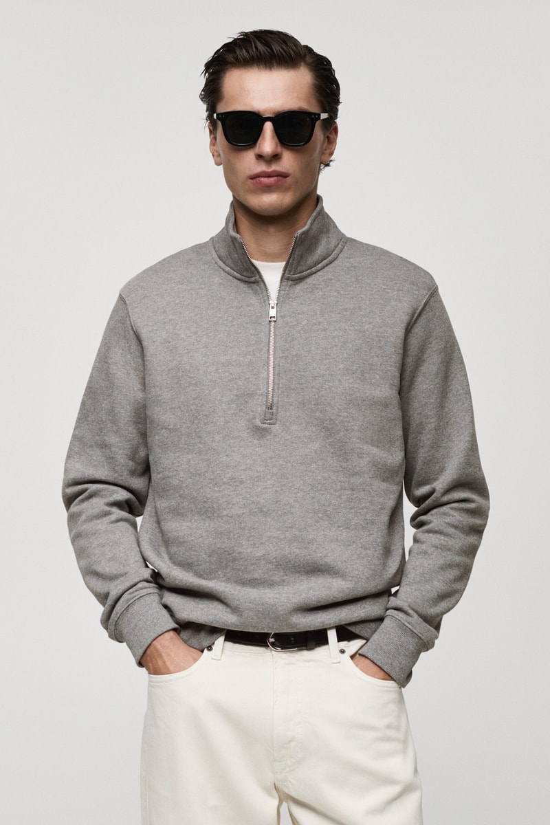 Sweat-shirt coton col zippé - Gris chiné