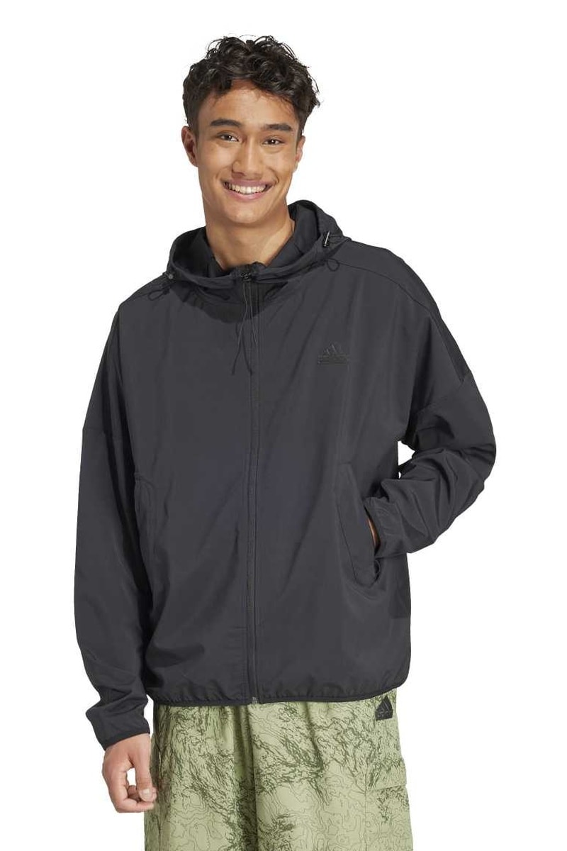 Coupe-vent à capuche avec liens de serrage et barillets.