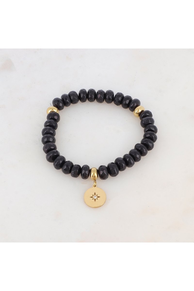 Bracelet élastique serti d’un onyx, de perles d’imitation et d’un zirconium.