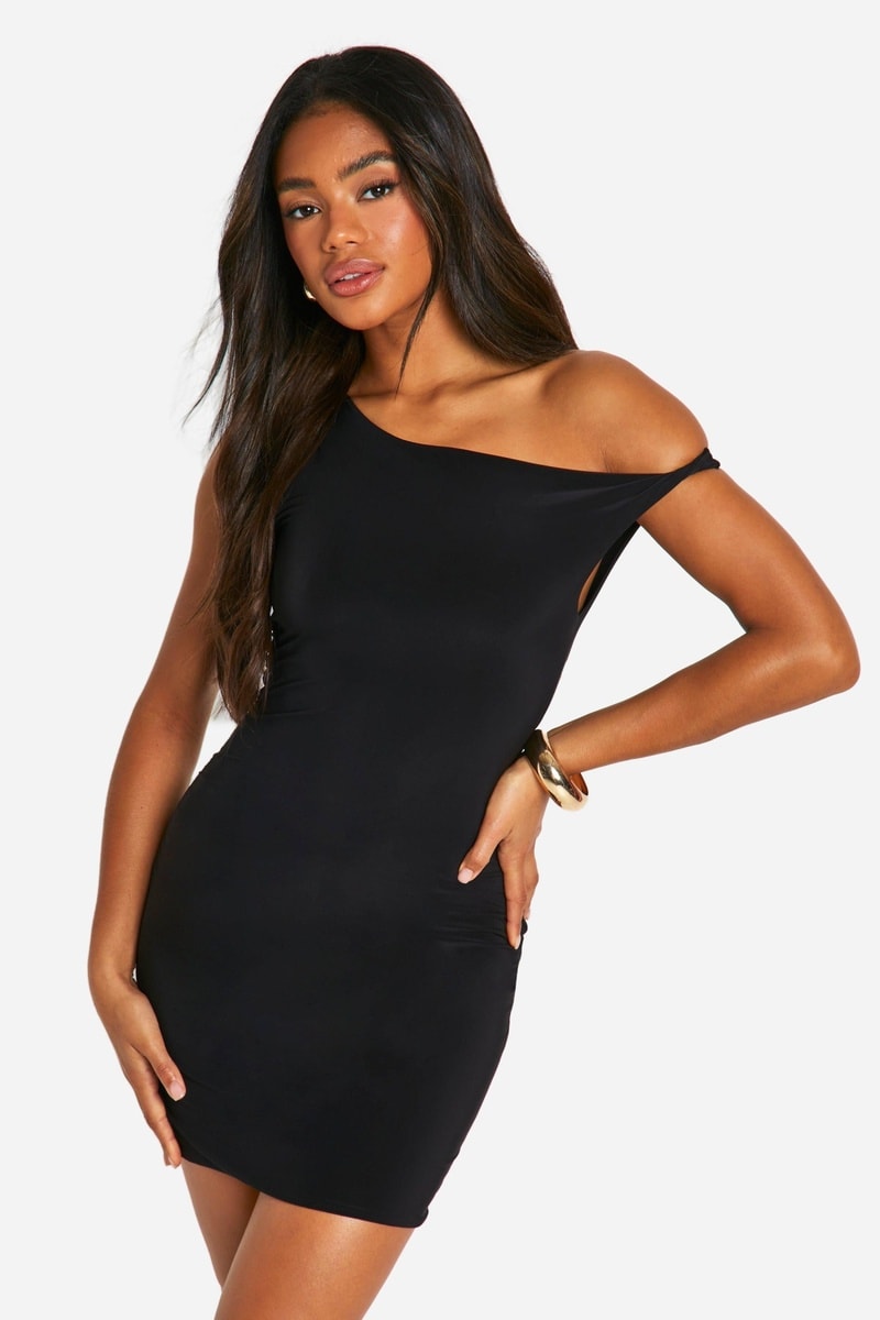 Sans manche sur le côté droit et fine bretelle sur le côté gauche.