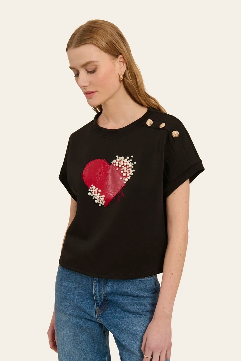 Motif cœur pailleté et perles décoratives devant.