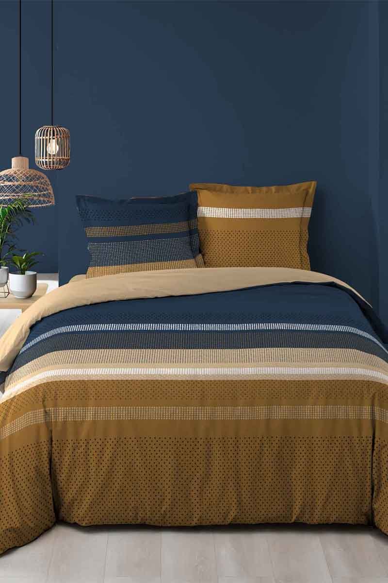 Parure de couette en coton 57 fils/cm² Massaï - Bleu marine et marron