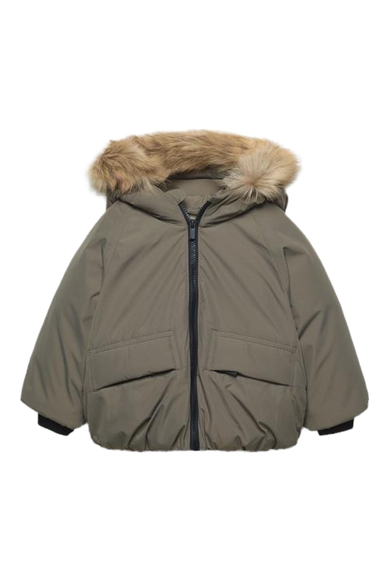 Doudoune à capuche en fourrure synthétique.