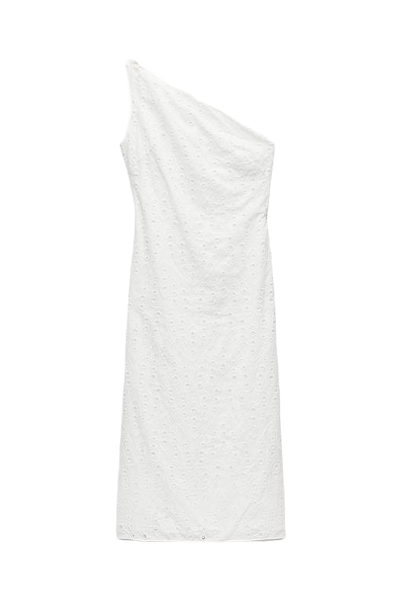 Robe asymétrique en broderie anglaise.