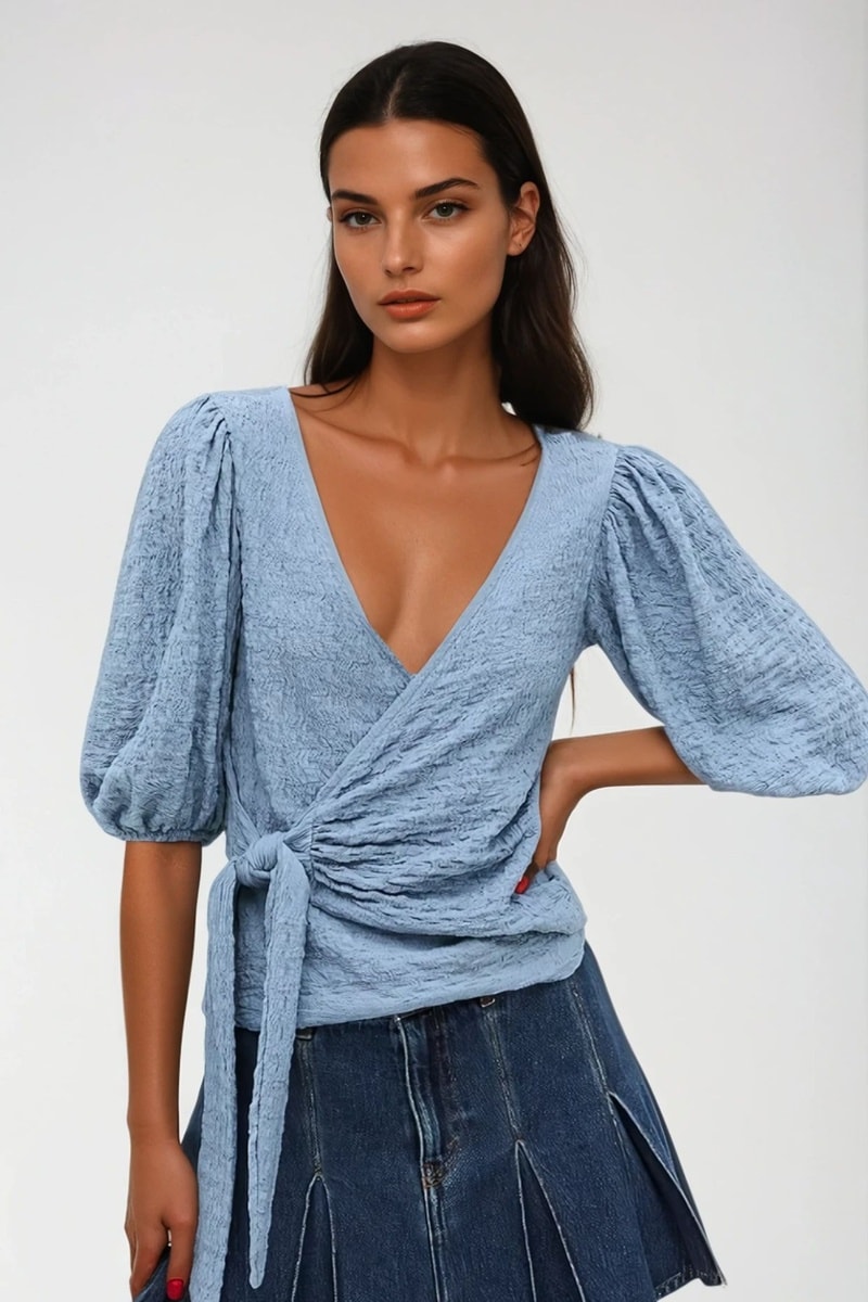 Blouse portefeuille à manches mi-longues bouffantes élastiques.
