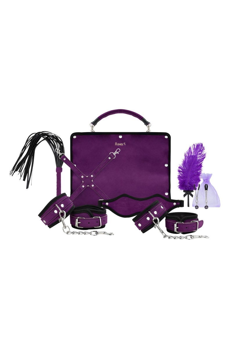 L'ensemble contient un jeu de menottes, un jeu de menottes pour chevilles, un bandeau, un fouet, un plumeau, des pinces à têtons, un système de fixation et une pratique pochette de rangement (41x30 cm).