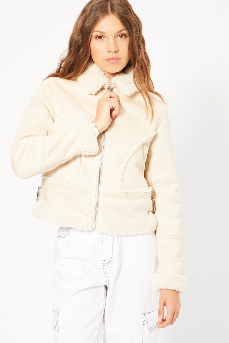 Fourrure synthétique à l’encolure, sur les manches et à la base.
