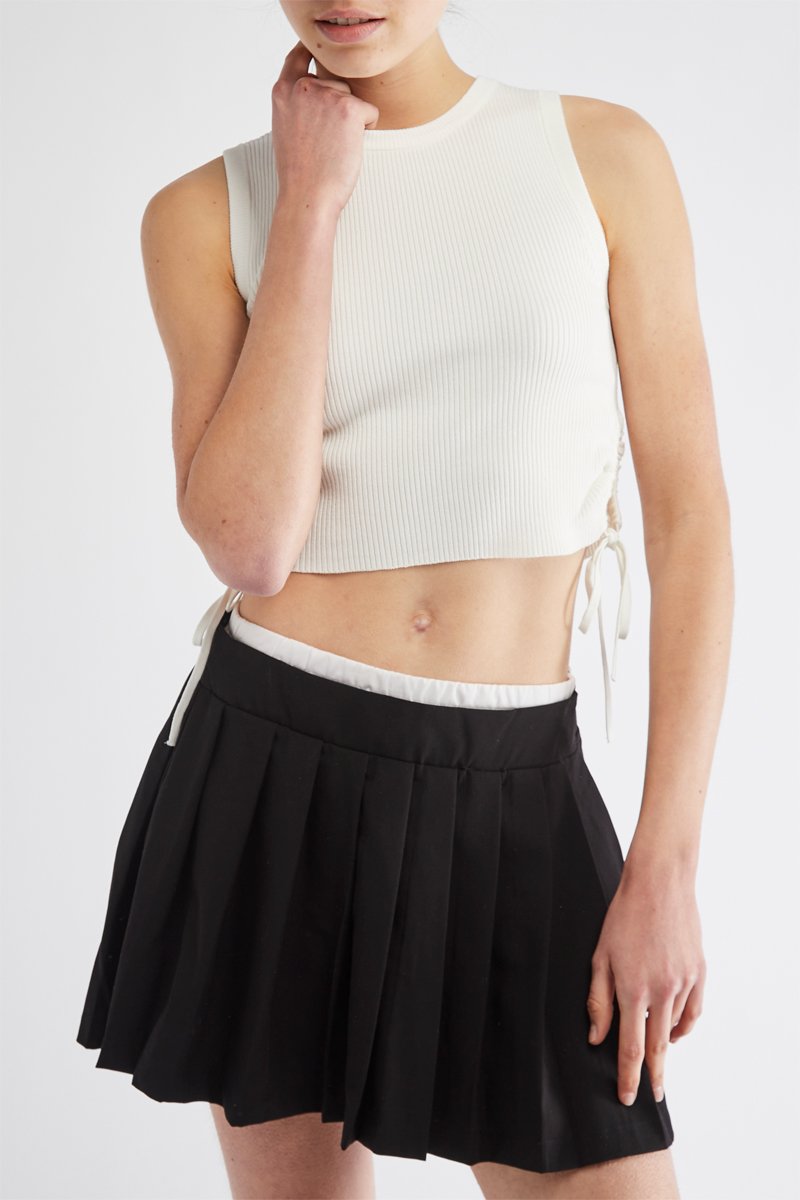 Maille côtelée. Découpe et liens à nouer sur les côtés.