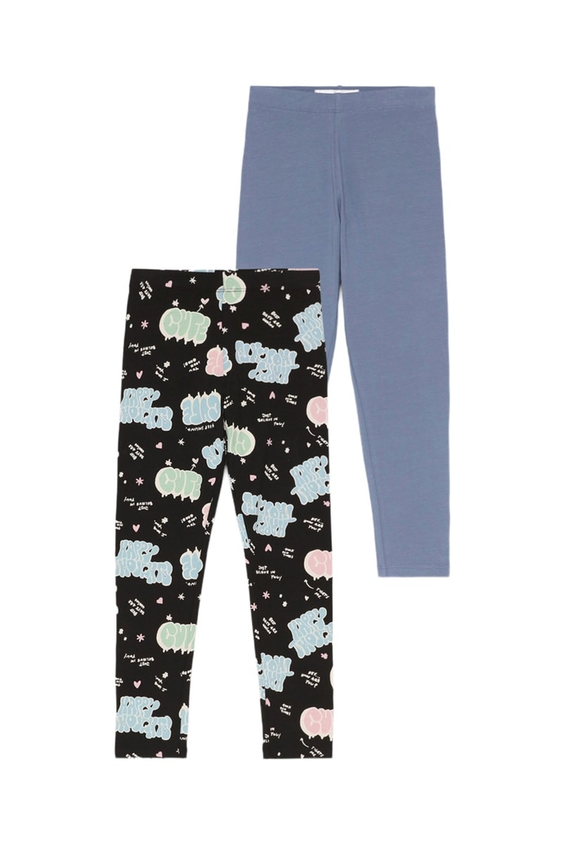 2 leggings dont 1 avec lettrage et motifs fantaisie.
