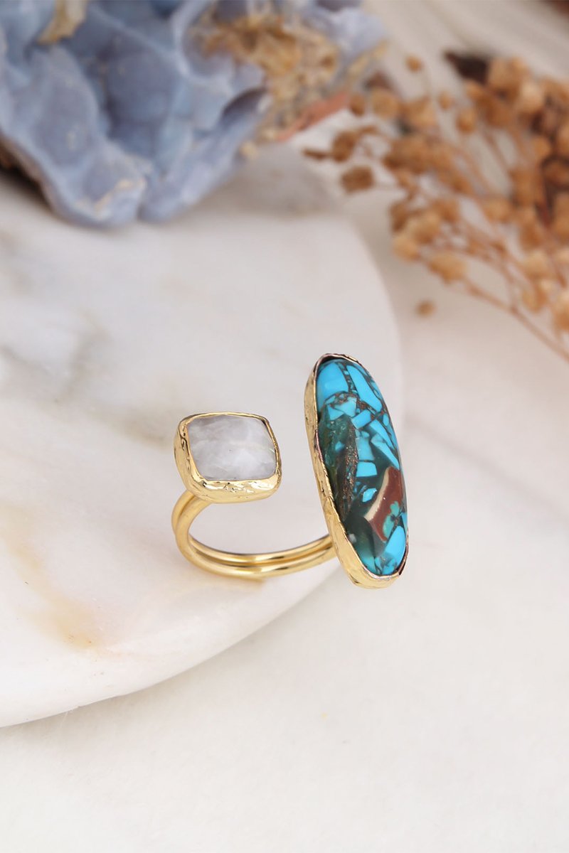 Bague réglable en plaqué or jaune sertie d’une turquoise et d'une pierre de lune.