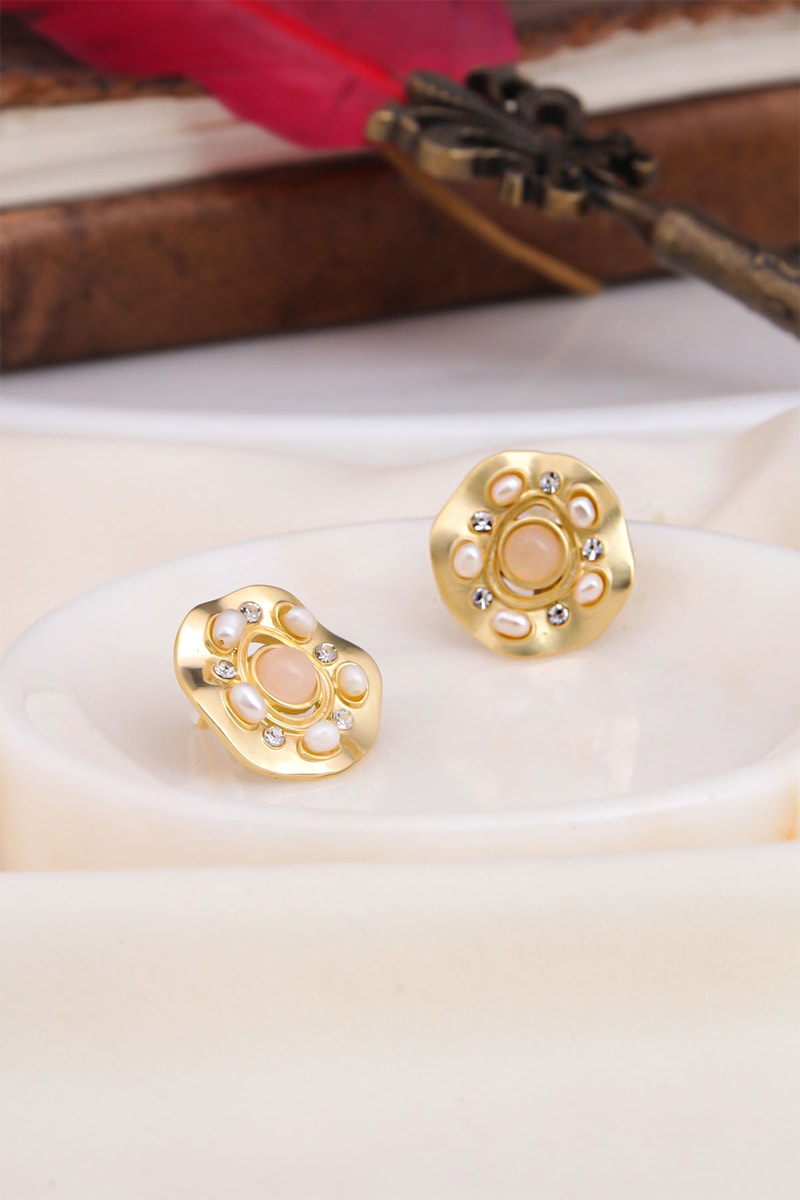 Boucles d’oreilles serties d’un quartz, de 5 perles d’imitation et de 5 cristaux.